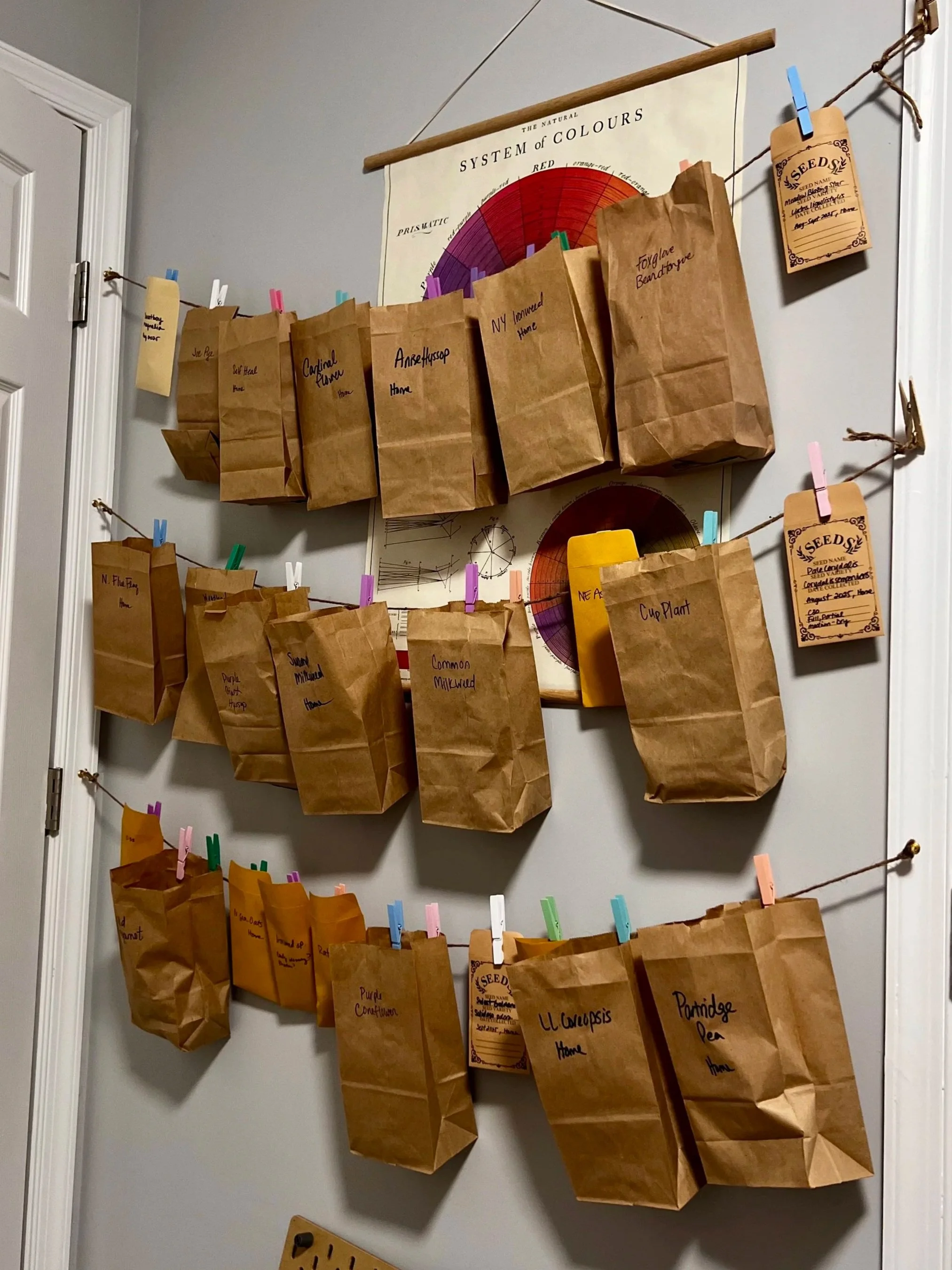 The seeds are already piling up this fall, drying in their paper bags on a clothesline in my house. It’s essential to wait to collect the seed heads once they are brown and the seeds easily come out. Sometimes the hardest part of seed cleaning is distinguishing the seeds from chafe, which I achieve mostly by looking up the species on Prairie Moon Nursery’s website.