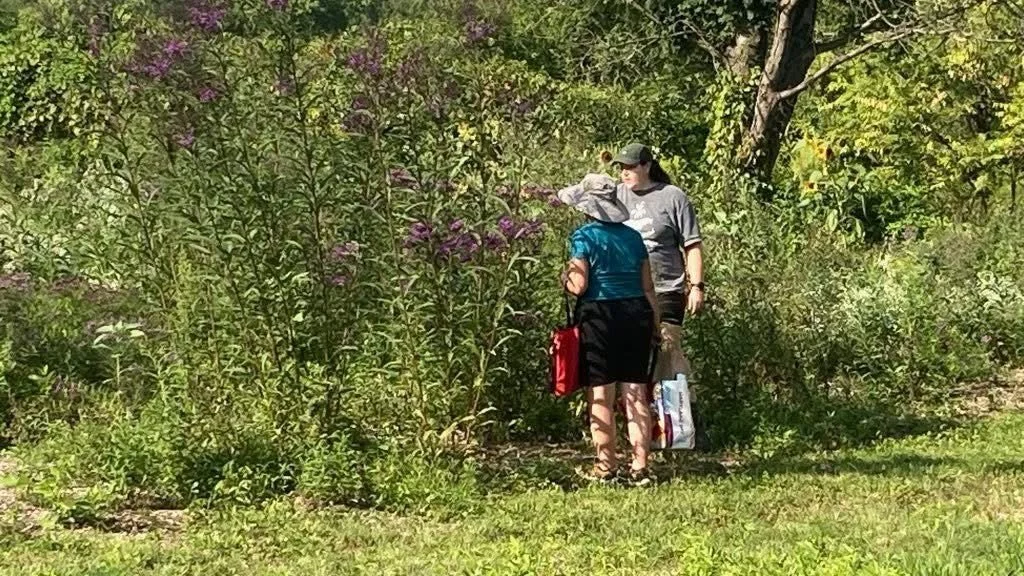 Miranda and Marlene Smith of WOCB assessing whether seeds from some Ironweed are ready to collect - at the USGS Bee Lab in Fall 2024